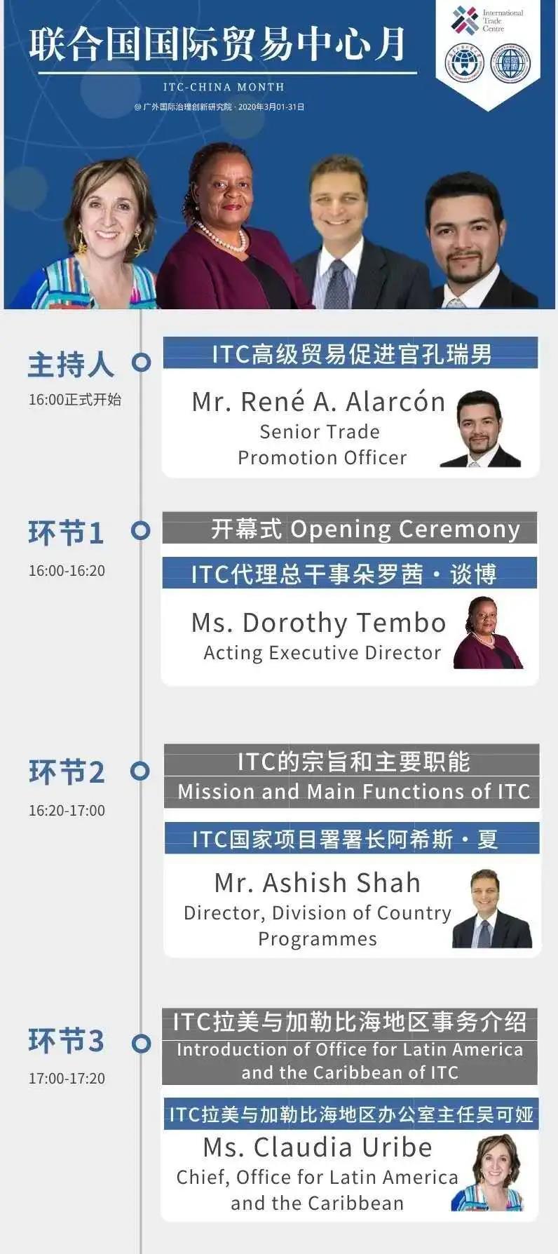 2020年3月2日16:00(日内瓦时间9:00),国际贸易中心(ITC)与国际治理创新研究院联合举办的联合国国际贸易中心月系列活动线上第一讲顺利举行。ITC代理总干事朵罗茜·谈博(Dorothy Tembo)女士出席并致辞。朵罗茜·谈博(Dorothy Tembo)女士在致辞中表达了ITC对中国抗击疫情的坚定支持。她强调,联合国国际贸易中心始终与中国团结一致,共同抵御疫情,并且对中国政府现阶段采取的一系列复工复产、恢复经济的措施表示高度信任ITC坚信,中国政府所采取的一系列措施一定能带来积极的效果,中国长期向好的经济形势不会改变,中国一定可以尽快解决目前的危机,继续为世界经济增长注入中国活力。启动仪式后,开始系列讲座第一讲,ITC国家项目署署长阿希斯·夏(Ashish Shah)先生、ITC拉美与加勒比海地区办公室主任吴可娅(Claudia Uribe)女士参加了本次讲座,ITC高级贸易促进官孔瑞男(René A. Alarcón)先生担任此次讲座的主持人。讲座中,阿希斯·夏先生和吴可娅女士分别对ITC的宗旨和主要职能、ITC协助发展中国家实现可持续发展目标的措施,拉美与加勒比海地区经济发展前景,以及ITC与中国合作等情况,进行了详细的介绍和讲解,并与大家进行了互动和交流。