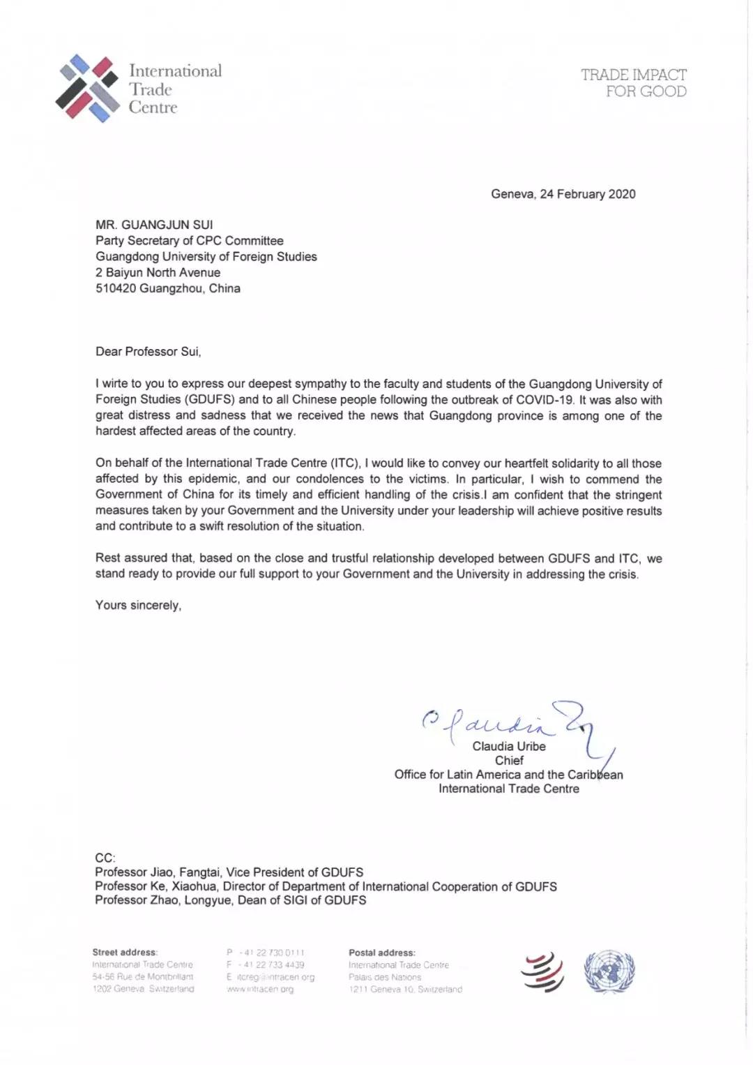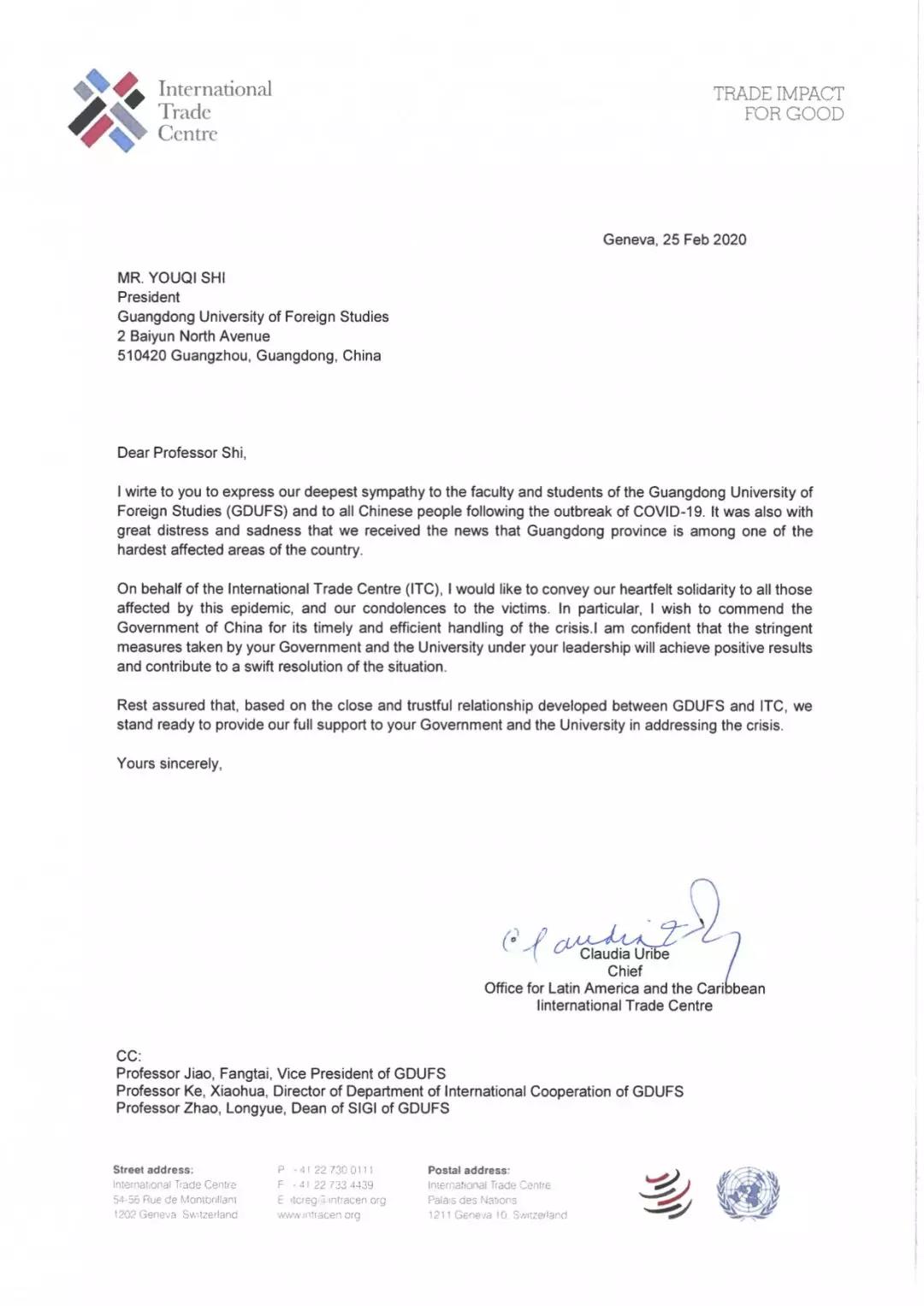 2020年2月24日,联合国国际贸易中心给我校隋广军书记和石佑启校长发来慰问信,表达了对遭受突发疫情影响的中国人民表示慰问和支持,赞扬了中国人民和政府抗击疫情精神,同时也送上了真挚祝福。
