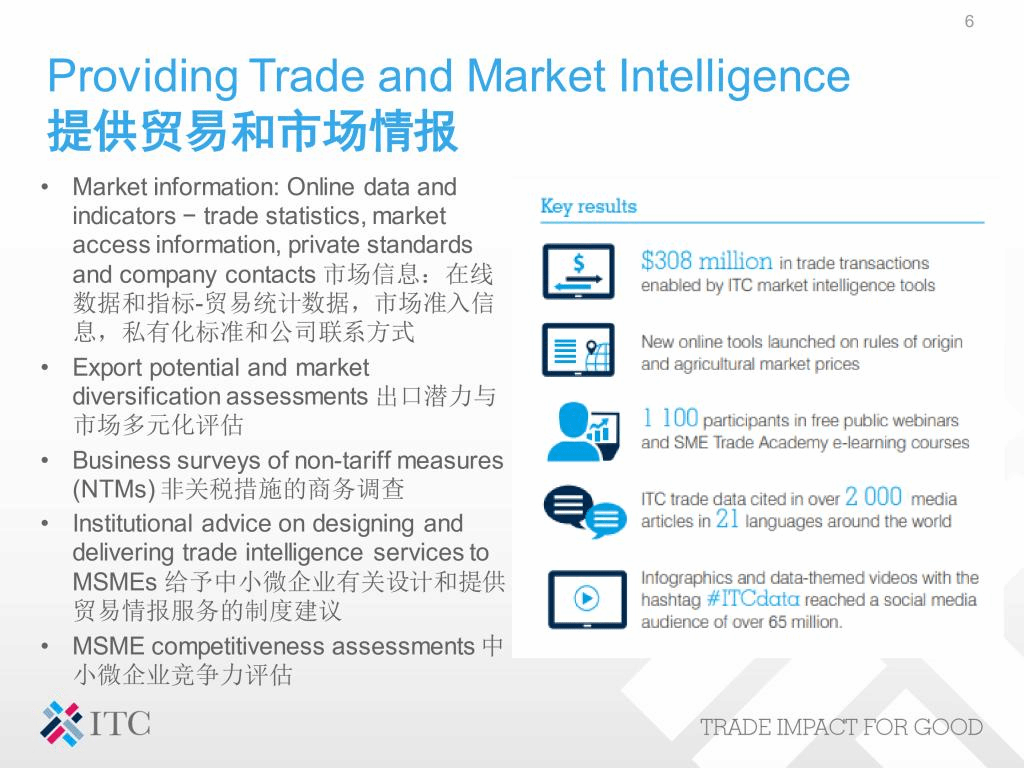 在贸易中,起关键作用的主体有贸易投资支持机构、中小型企业(SMEs)与决策者。ITC通过了解这些主体的贸易需求,一方面支持决策者、贸易投资支持机构营造更加有利的商业环境,另一方面争取为中小型企业提供更多服务。ITC通过直接与中小型企业合作,改善其业务运作,加强其市场联系,使其能够吸收投资和进行国际贸易。ITC的贸易情报工作服务于全球受众,作为全球公共产品,其影响国际贸易相关研究、分析和宣传。