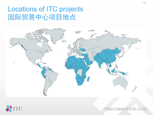 针对这三大主体和六大领域,ITC在全球范围内提供公共免费线上贸易和市场智能工具,如贸易地图、市场准入地图、投资地图、贸易竞争地图、标准地图、采购地图、出口潜力地图、发展可持续性地图等。目前,全球129个国家中已有大部分都接受了ITC公共智能工具的支持和协助。同时,ITC已有133个贸易相关的工具协助项目正处在计划执行中,共计投入1亿美金用于项目发展。