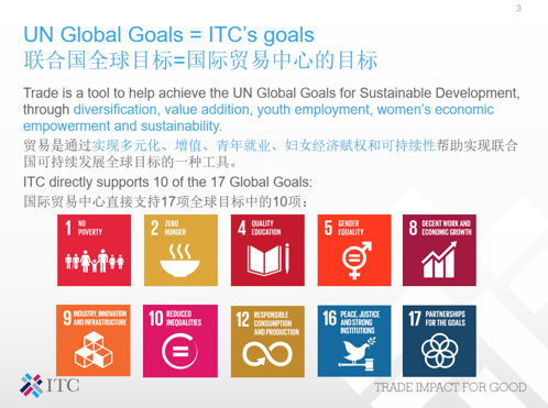 联合国国际贸易中心(International Trade Center),简称ITC,是联合国贸易与发展大会(UNCTAD)和世贸组织(WTO)联合设置的机构,于1964年在瑞士日内瓦成立,由联合国和世贸组织共同管理,并作为联合国开发计划署的执行机构,直接负责执行开发计划署资助的发展中国家和转型经济国家贸易促进项目。贸易可以通过实现多元化、增值、青年就业、妇女经济赋权和可持续性来帮助实现联合国17个可持续发展全球目标。目前,ITC直接支持这17个目标中的10项,分别为:消除贫困;消除饥饿;优质教育;性别平等;体面工作和经济增长;工业、创新和基础设施;缩小差距;负责任的消费和生产;和平、正义与强大机构;促进目标实现的伙伴关系。