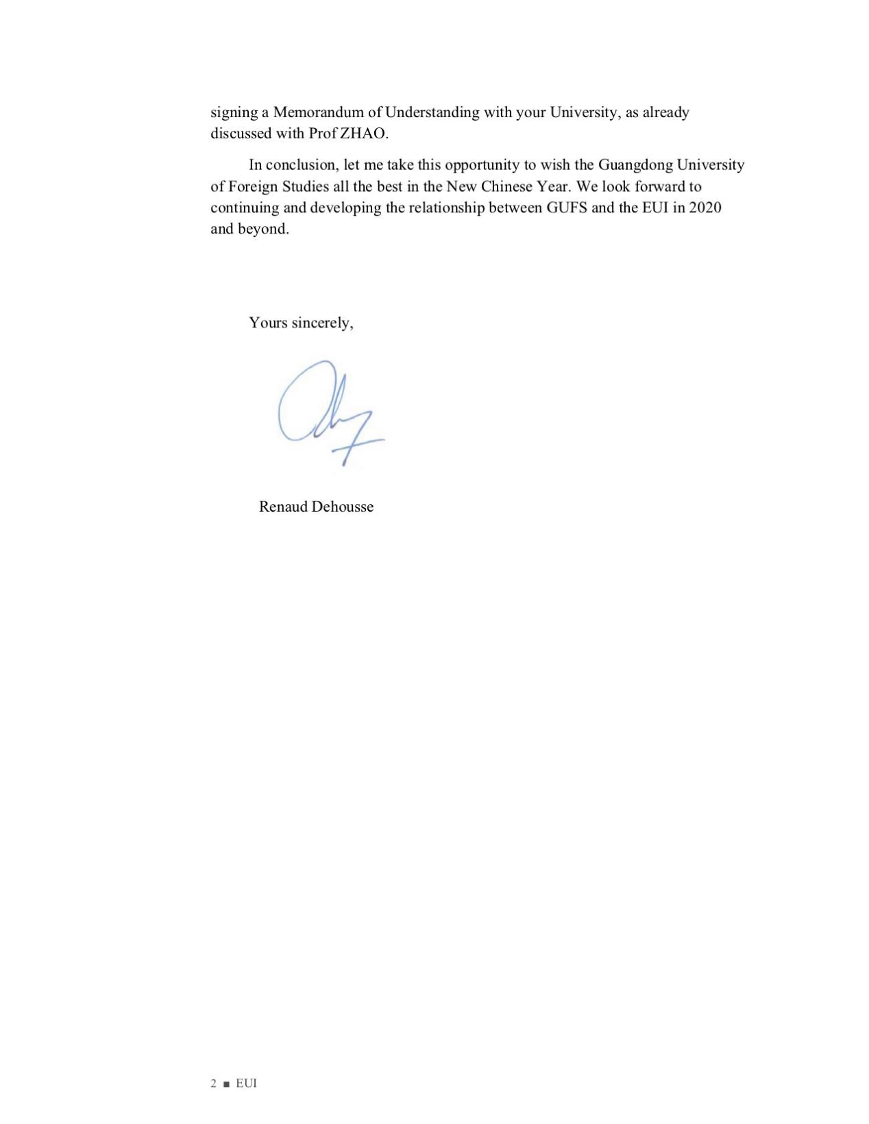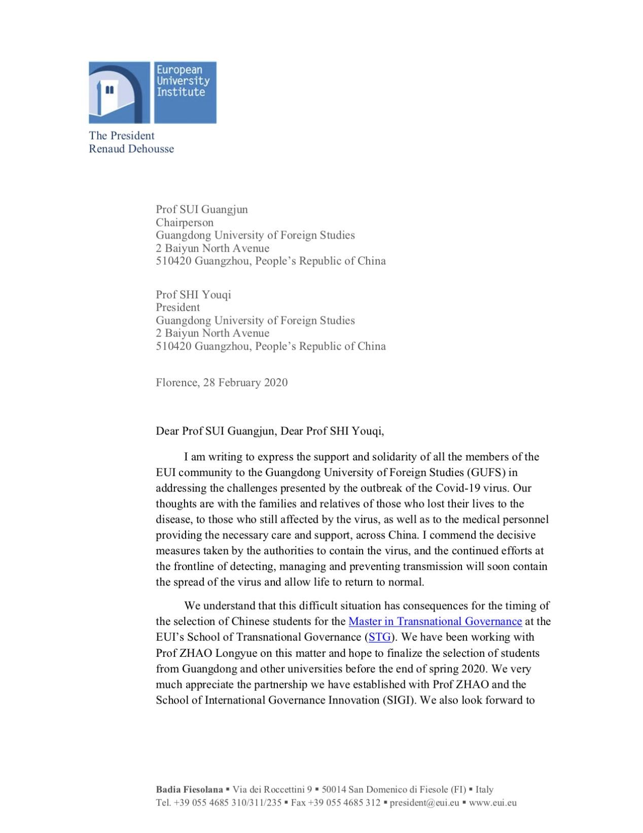 在我校全力抗击疫情之际,欧洲大学研究院校长雷诺·德乌斯 Renaud Dehousse教授特地发来慰问信,对我国政府应对疫情的果断举措表示高度赞赏,并对当下两校合作的招生项目中因疫情防控期间所采取的延长招生时间、暂时不提供英语成绩要求等做法表示理解。信中,欧洲大学研究院表示愿意与我校团结一致抗击疫情,共同商讨在疫情影响下招生遴选问题的解决办法,进一步深化与广外国际治理创新研究院的合作。