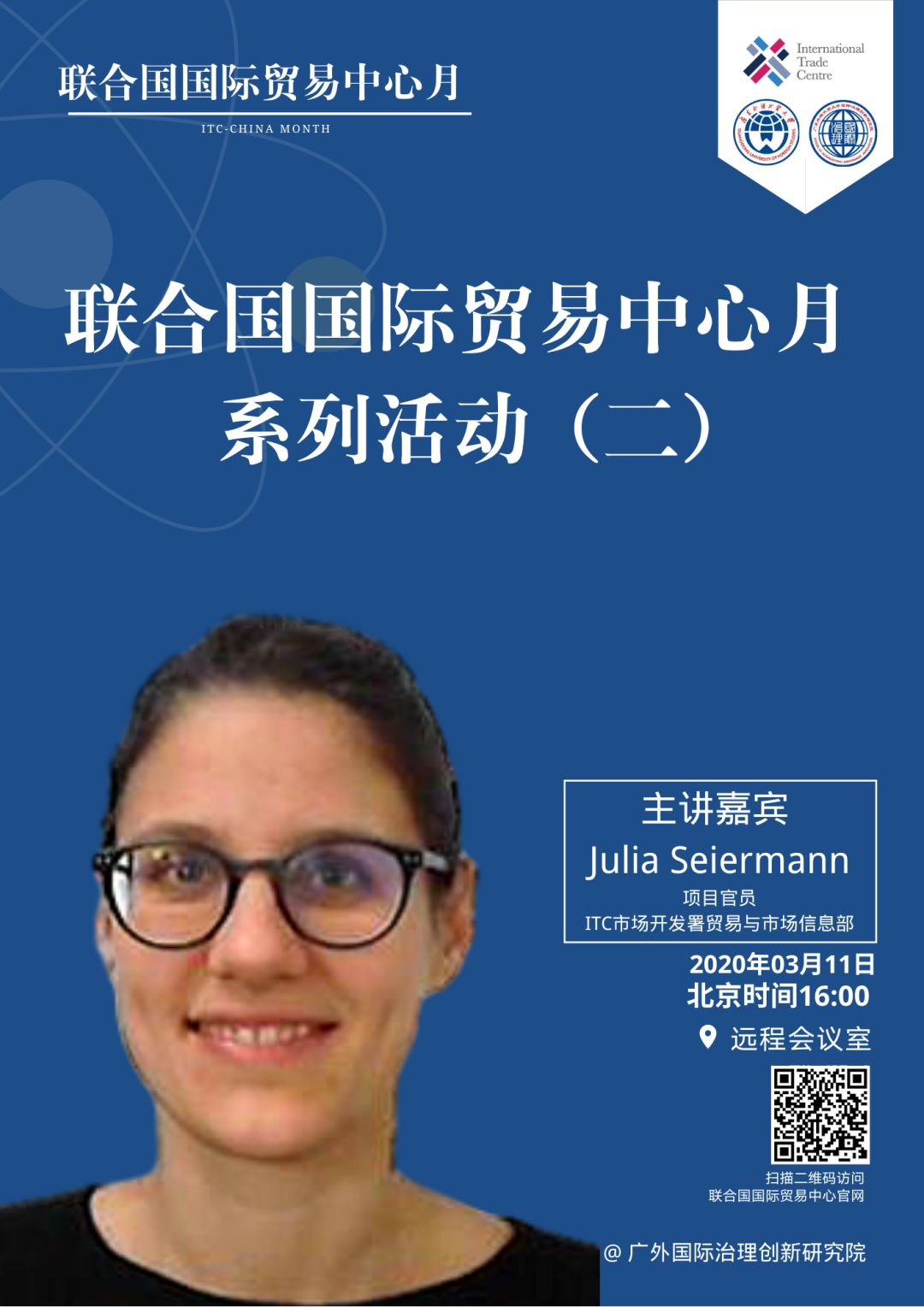 北京时间2020年3月11日16:00,联合国国际贸易中心(ITC)与国际治理创新研究院联合举办的“联合国国际贸易中心月”系列活动之专题二讲座第二讲顺利举行。