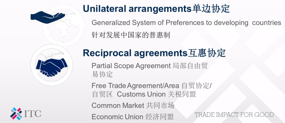最惠国关税是WTO成员国从其他成员国进口商品一致享受到的最惠国待遇关税,通俗来讲就是WTO成员国给予一个贸易伙伴(无论是否为WTO成员国)关税减让时,必须对所有其他WTO成员国一视同仁,给予“同等优惠”待遇。但也会有一些特殊情况,比如区域贸易协定(自由贸易区和关税同盟),加入此类协定的成员国可以取消彼此之间的进口关税,同时维持对其他国家的进口关税税率。或是普惠制(GSP),即允许发达国家和部分发展中国家对来自发展中国家的进口商品实行“单边”的关税减让。