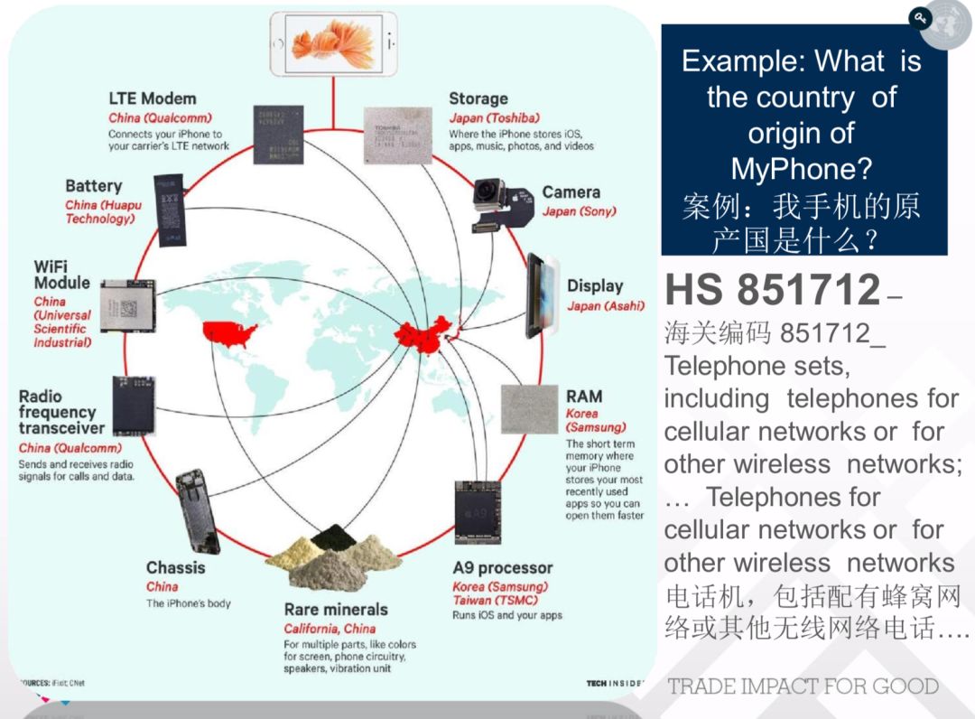 安东尼娅在充分解释了有关概念之后,以一部中国出口的手机所经历的环节为例来进行讲解。首先是手机的零部件,如下图,手机每一个零部件的产地都有所不同,如4G模块和wifi模块等部件的产地是中国,屏幕总成、摄像头等配件的产地是日本,稀有矿土的产地是美国......可以看出一部手机是全球化的产物。