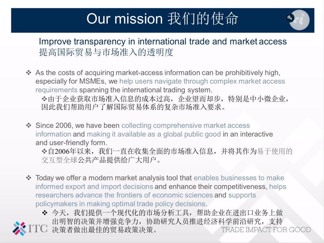 在这一部分,安东尼娅给我们讲述了NEW Market Access Map(新市场准入地图)。新的结构包括四个主要模块:分别是进入市场、比较不同市场准入条件、,分析市场以及下载数据。