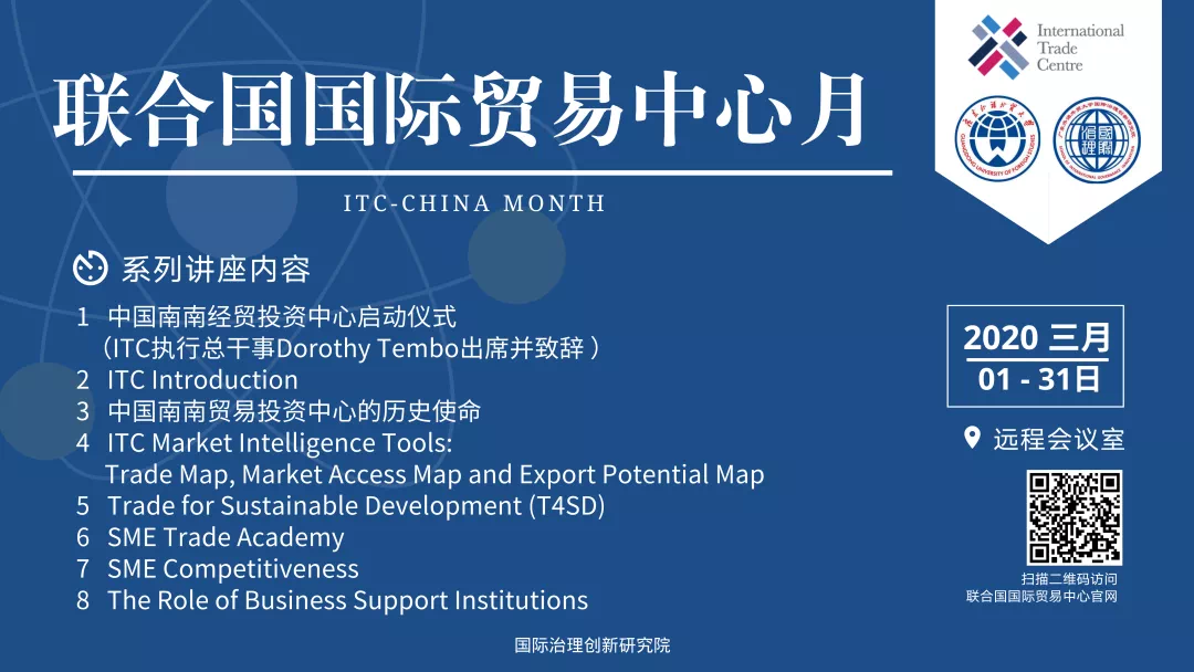 今年三月,伟德国际betvlctor1946国际治理创新研究院与联合国国际贸易中心(简称ITC)在华联合举办“联合国国际贸易中心月”系列讲座活动,就如何帮助企业复工复产等话题通过线上课程给予思路指引和资源提供。系列活动共开展了八次培训讲座,内容涵盖了ITC贸易和市场分析数据库资源,辅以加强企业管理方法,旨在通过贸易增强企业竞争力的同时促进可持续发展。联合国国际贸易中心发文称,“联合国国际贸易中心月”的成功举办帮助中国企业复工复产,将进一步加强中国与拉美加地区之间的“南南合作”。