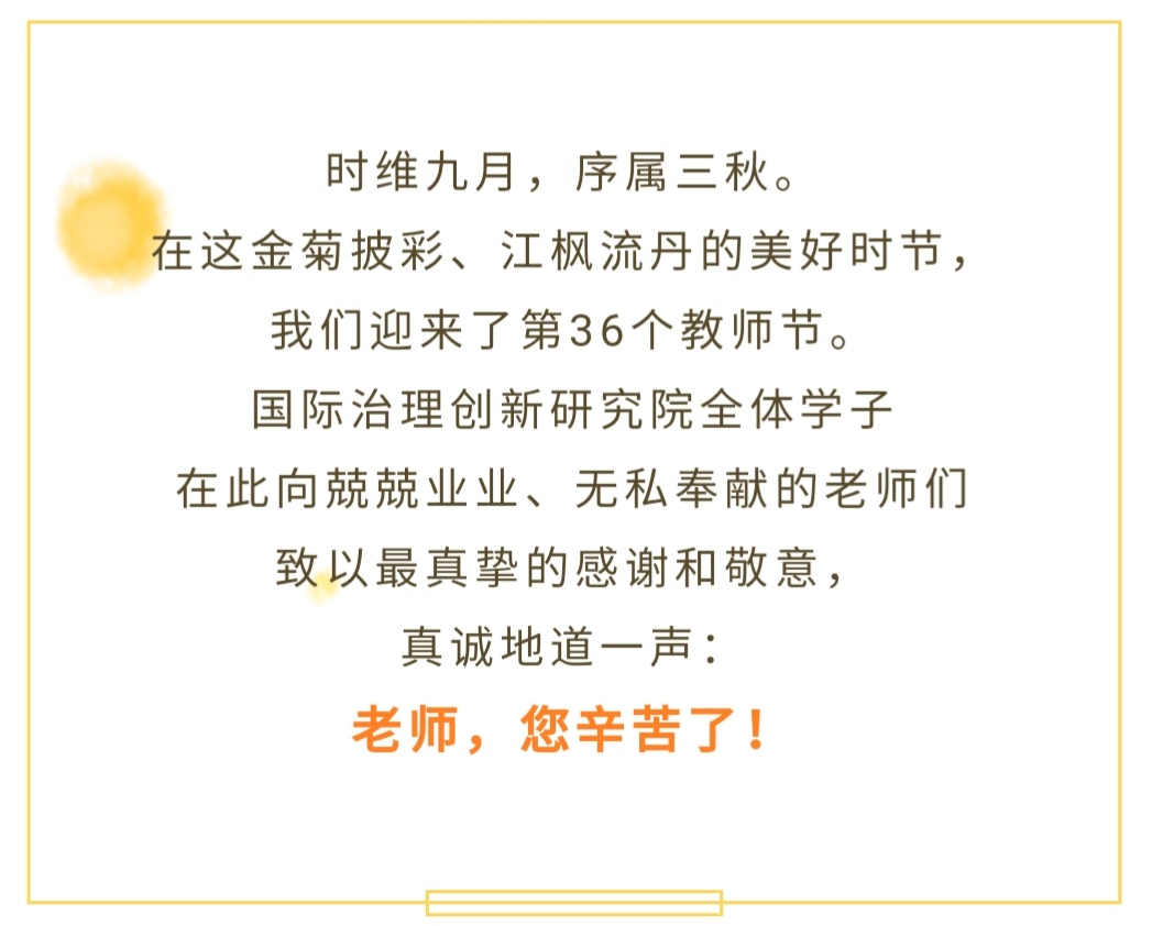 一支粉笔两袖清风,三尺讲台四季晴雨。老师们辛勤的付出,远远不是寥寥数语便可说尽。对老师的感恩与尊敬,应当用学生自身的成长与进步来回报。我们应秉承“明德尚行,学贯中西”的校训,珍惜研究院提供给我们的优质教育资源,奋发图强,努力成为新时代的国际人才,以此回报我们的祖国、我们的社会、我们的老师!