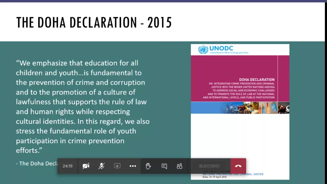 此外,UNODC也有针对年轻人的资助项目(E4J Grant Programme),为世界各国青年人提供参与各类会议的机会。同时,UNODC也积极同全世界的学者、政策制定者共同探讨如何加强国际合作以增强全球的法治。