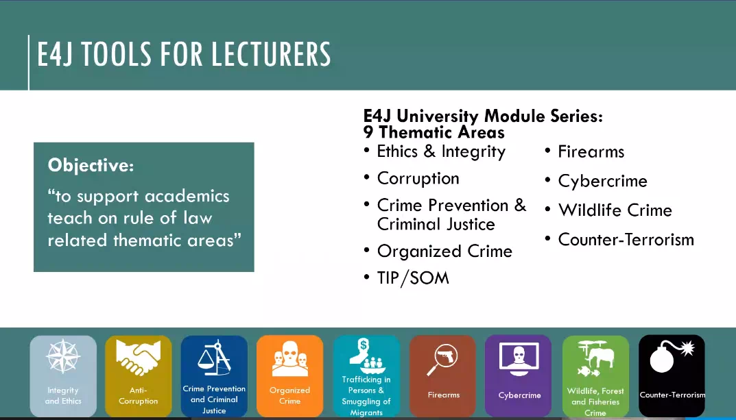 “E4J高等教育模块” 旨在协助高等教育人员和学者传授知识并使学生加深理解与法治有关的问题,重点主题领域有:预防犯罪和刑事司法、反腐败、有组织犯罪、贩运人口和偷运移民、枪支、网络犯罪、破坏野生生物、森林和渔业犯罪、打击恐怖主义以及廉正和伦理道德。大学模块系列和相关工具是与400多所大学和96个国家的590多名学者和国家专家联合开发的。大学模块既可用作单独的教学资源,也可作为一种手段改进犯罪学、法律、政治学、国际关系、社会学和其他许多学科的现有课程。目前,这一模块的进展情况良好,但Bianca女士指出仍需要教师根据不同的课程结构与学生背景等因素进行相应的调整,选择适合自身及学生的话题与方法来开展教学。