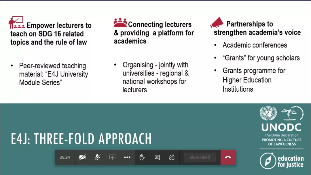 会议伊始,Bianca女士首先为大家介绍了UNODC与E4J项目的目标与背景。