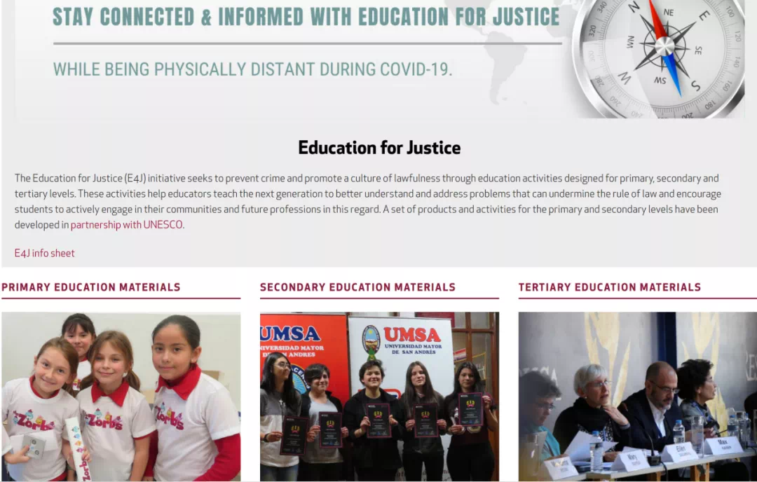 E4J项目是UNODC开展的一个全新项目,旨在通过小学、中学和高等教育层面的教育活动,预防犯罪和促进守法文化。这些活动将帮助教育工作者教导下一代人更好地理解并解决那些可能会破坏法治的问题,并鼓励学生积极参与社区活动,并在未来从事此方面职业。UNODC正与教科文组织合作,为小学和中学教育开发一系列产品和活动。
