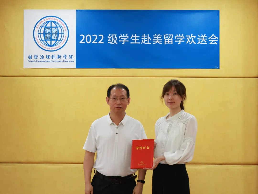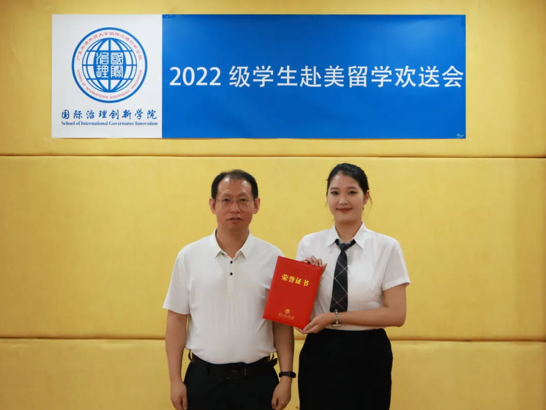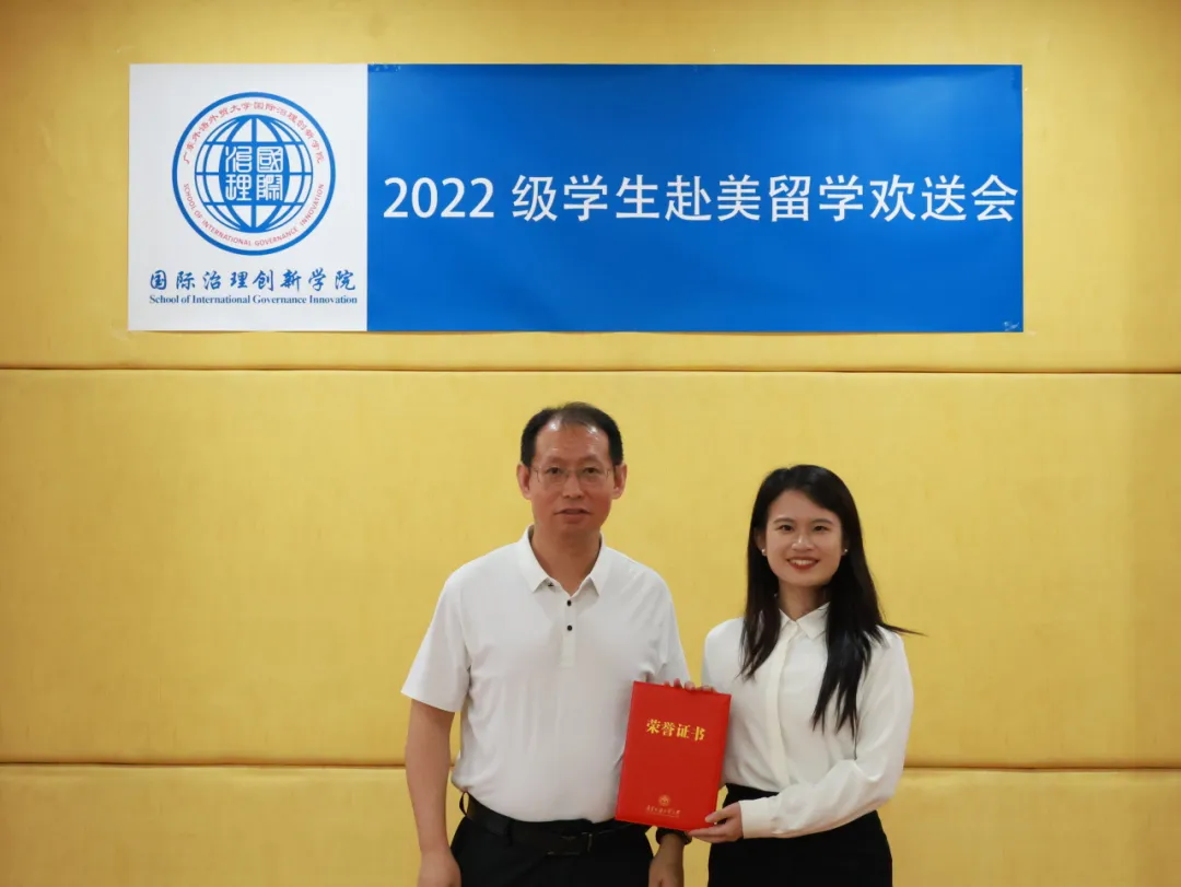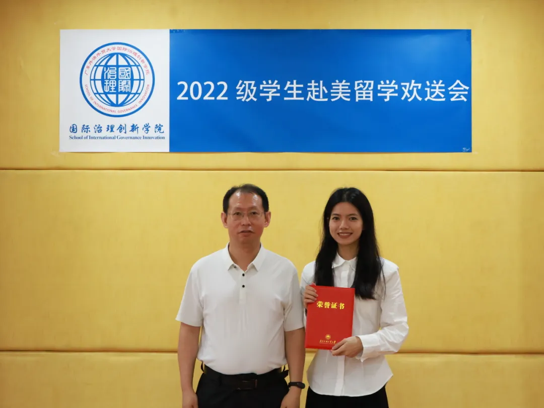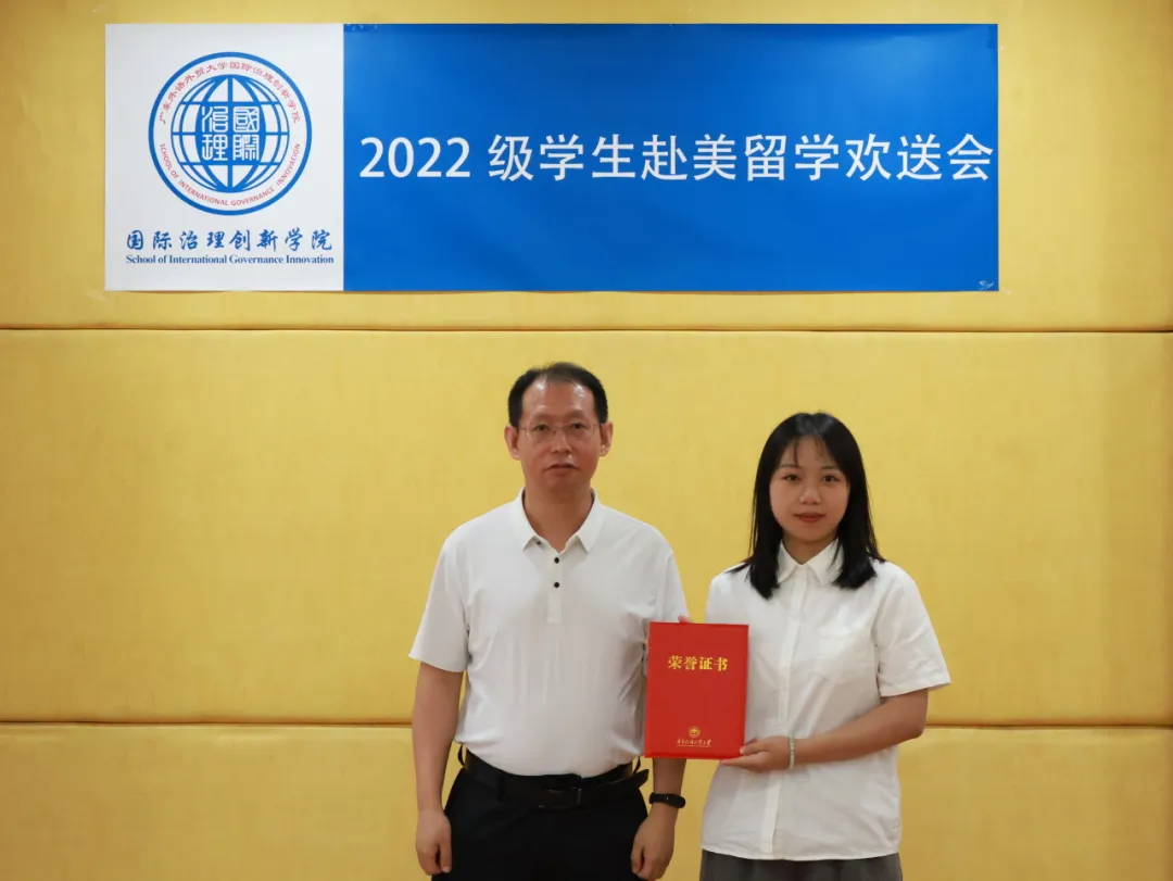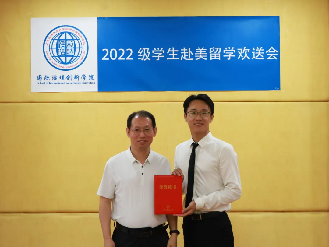 国际治理创新硕士研究生项目2022级研究生贾晓泽与2023级研究生徐雨欣作为学生代表发言,分享他们在伟德国际betvlctor1946学习的经历与收获。贾晓泽表示,在伟德国际betvlctor1946的两年学习与历练是一笔宝贵的人生财富。在协助学院承办中国国际经济法学会年会、国际治理论坛、全球市长论坛分论坛等活动中,同学们经历了诸多困难和挑战的洗礼,但最终仍以“会当凌绝顶,一览众山小”的信念努力攀登一座座高山,于夜以继日的奋斗中建立起了师生间、同学间的牢固知识联系与弥足珍贵的深厚情谊。徐雨欣向即将赴美的师兄师姐们表达了诚挚的祝福和感谢。她表示要向师兄师姐们学习,读万卷书,行万里路,让青春扎根于祖国的热土,将自己的理想与国家、民族、社会融为一体,做有为的青年人。同时也祝愿师兄师姐们在新的起点扬帆远航,实现人生的理想与价值,成为祖国和民族的栋梁,成为母校永远的骄傲。