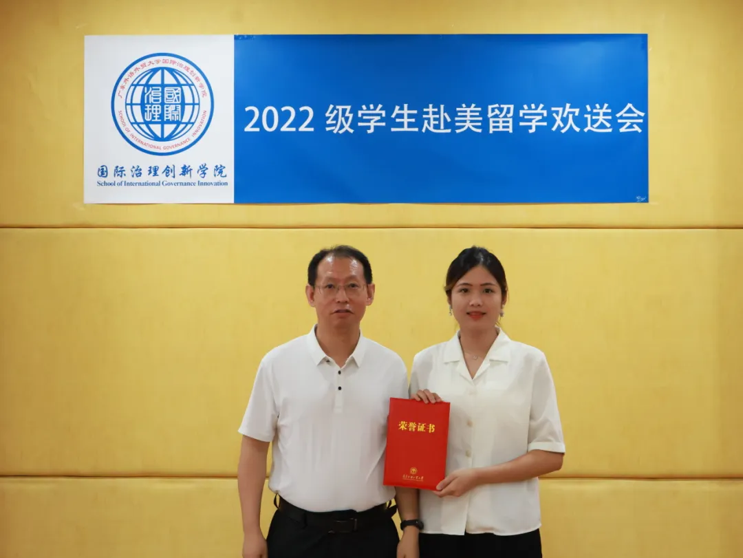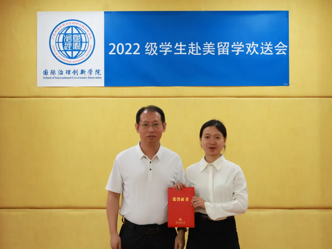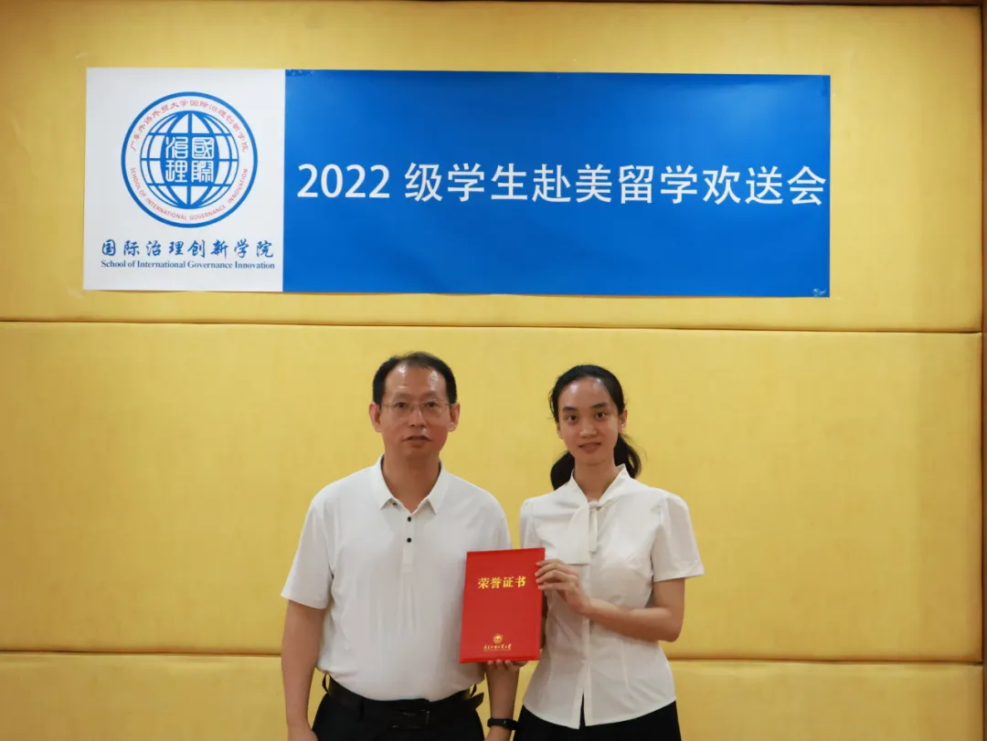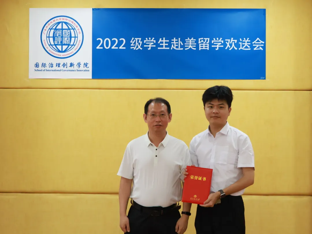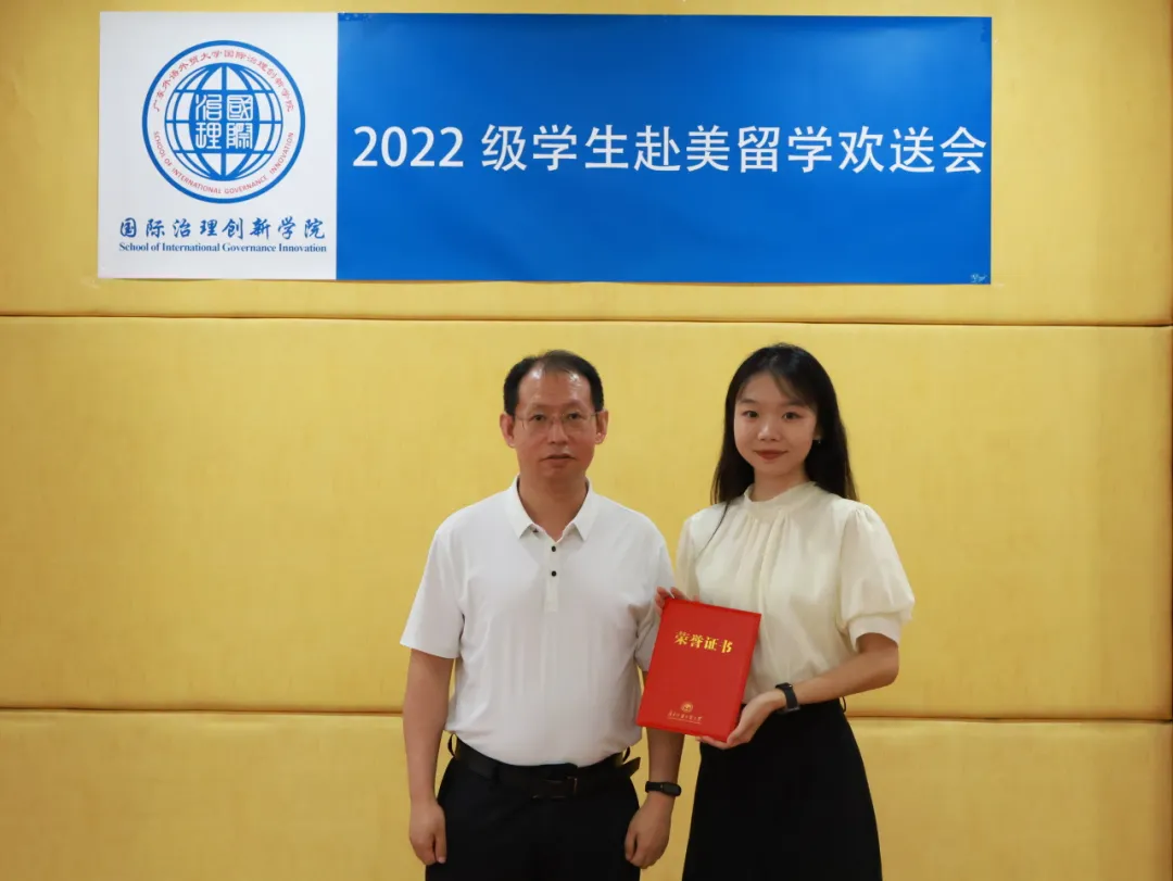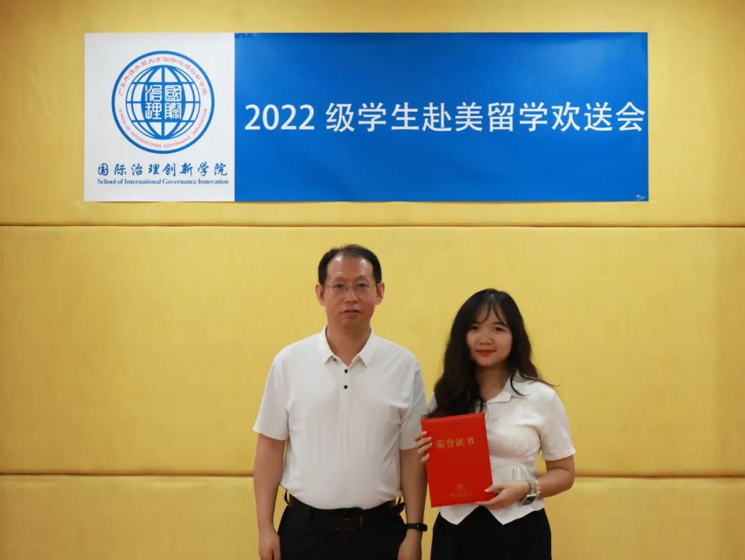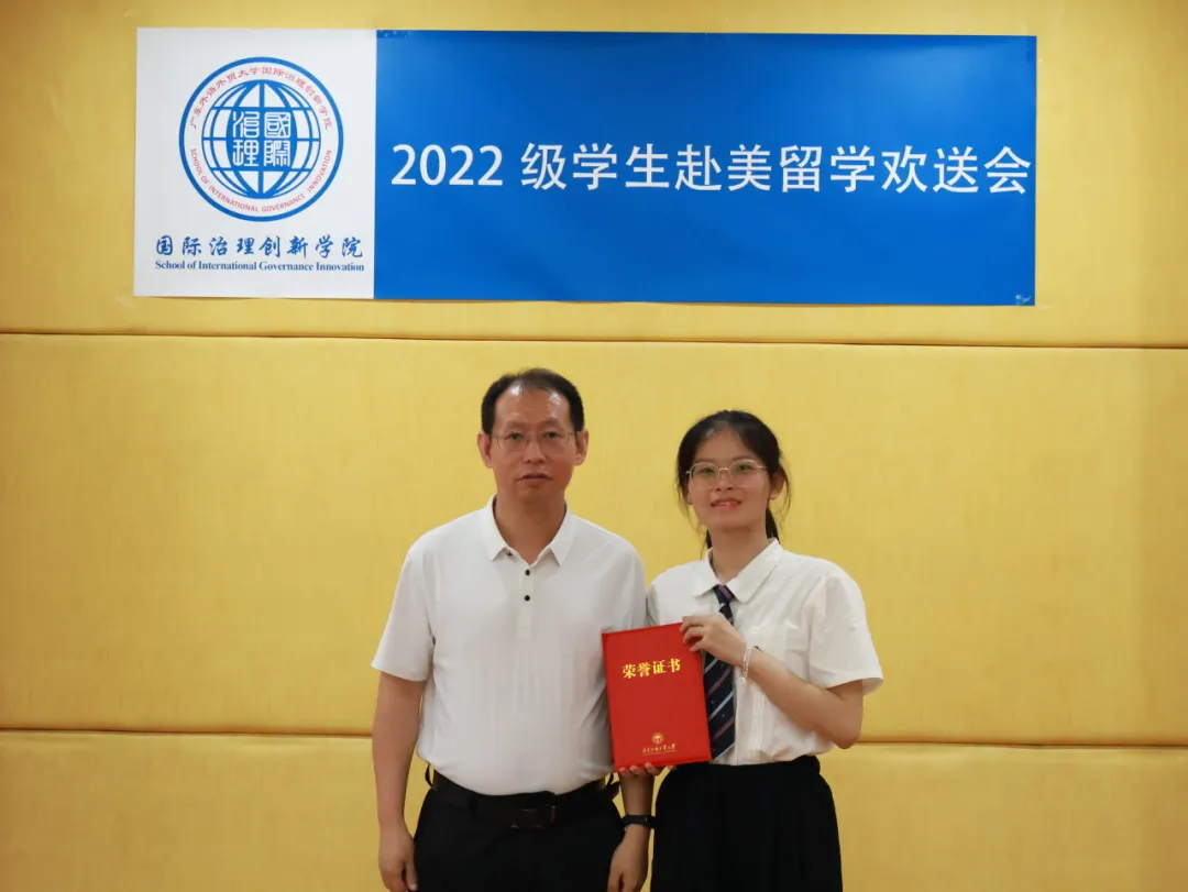 国际治理创新硕士研究生项目2022级研究生贾晓泽与2023级研究生徐雨欣作为学生代表发言,分享他们在伟德国际betvlctor1946学习的经历与收获。贾晓泽表示,在伟德国际betvlctor1946的两年学习与历练是一笔宝贵的人生财富。在协助学院承办中国国际经济法学会年会、国际治理论坛、全球市长论坛分论坛等活动中,同学们经历了诸多困难和挑战的洗礼,但最终仍以“会当凌绝顶,一览众山小”的信念努力攀登一座座高山,于夜以继日的奋斗中建立起了师生间、同学间的牢固知识联系与弥足珍贵的深厚情谊。徐雨欣向即将赴美的师兄师姐们表达了诚挚的祝福和感谢。她表示要向师兄师姐们学习,读万卷书,行万里路,让青春扎根于祖国的热土,将自己的理想与国家、民族、社会融为一体,做有为的青年人。同时也祝愿师兄师姐们在新的起点扬帆远航,实现人生的理想与价值,成为祖国和民族的栋梁,成为母校永远的骄傲。