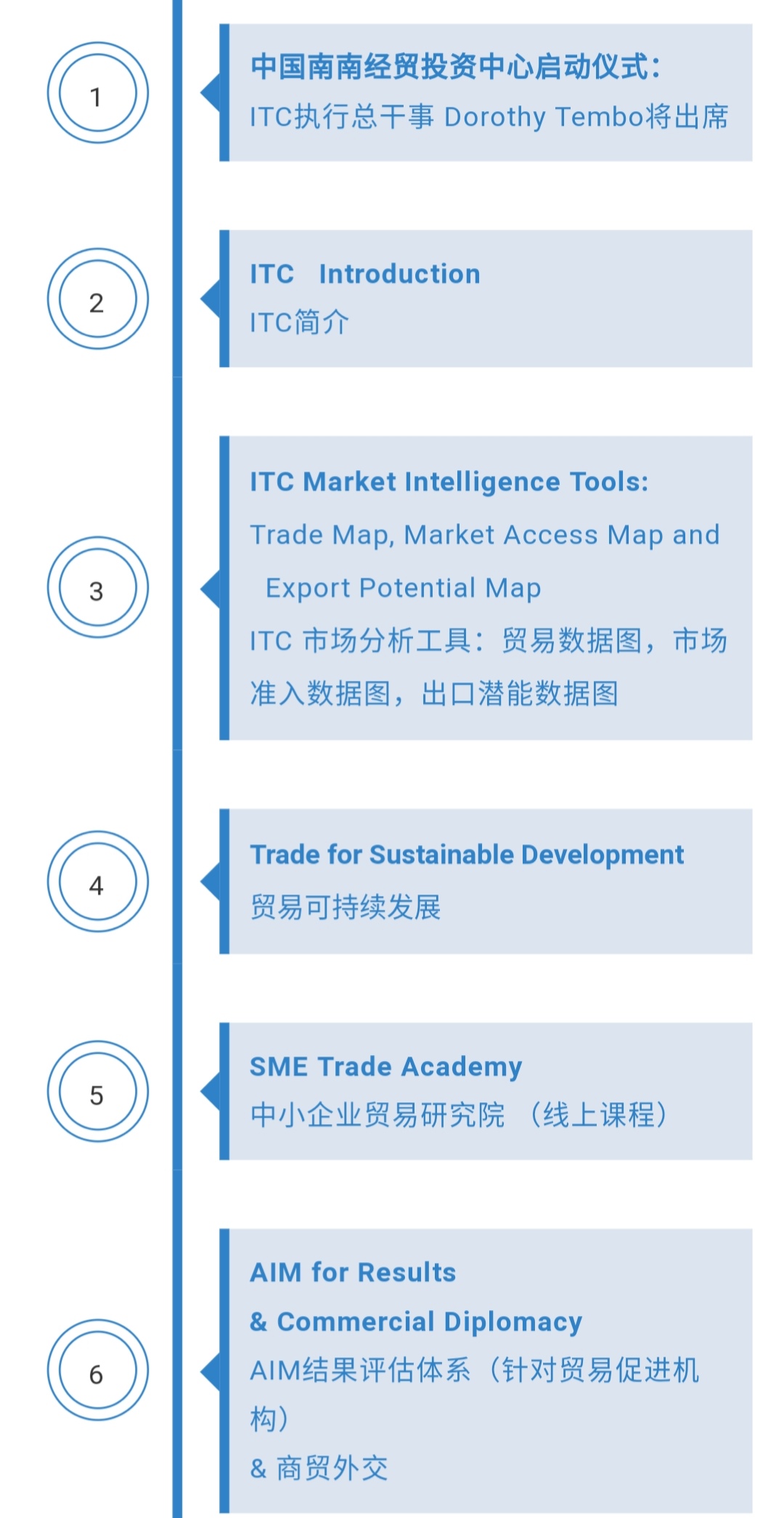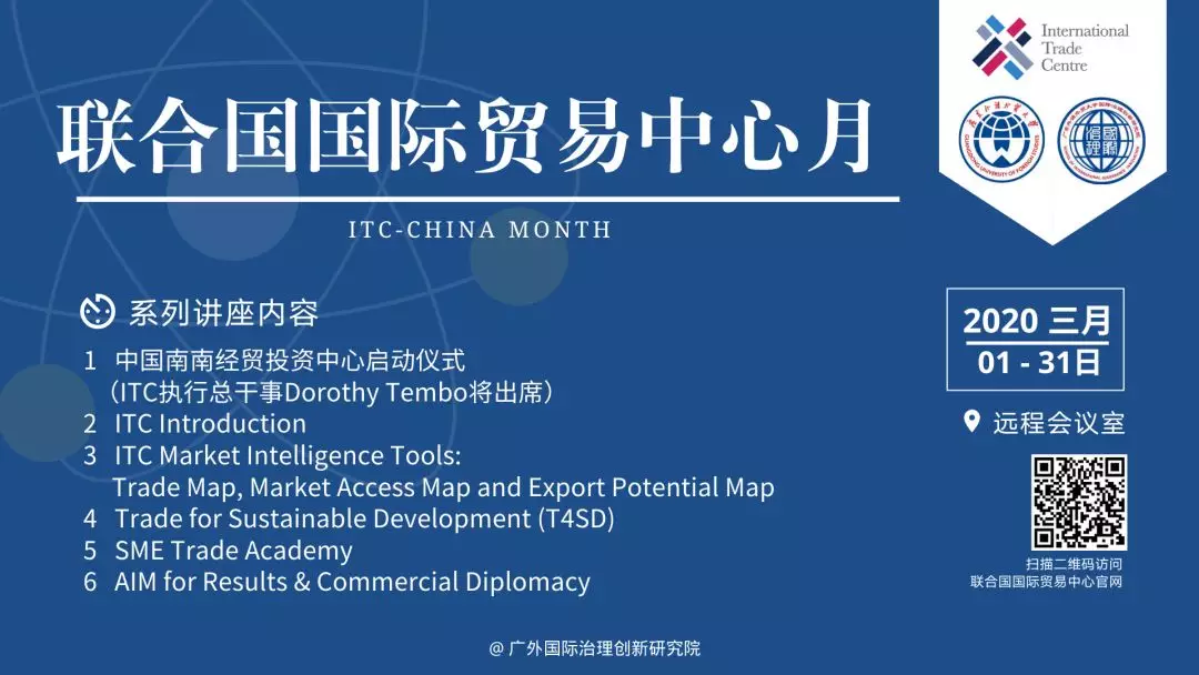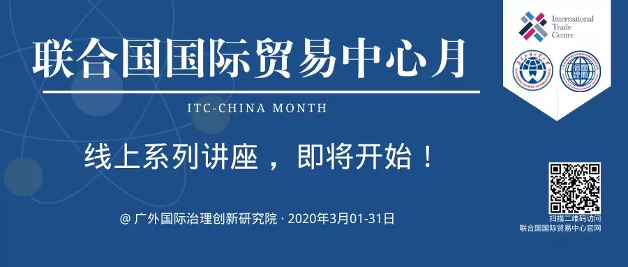 2020年3月,ITC与国际治理创新研究院将在华联合举办联合国国际贸易中心月系列活动,届时ITC将组织有关专家,通过网络资源,专门为我国政府、企业和教学研究机构等,系统了解国际贸易中心的组织机构、重要职能、数据资源和政策工具等,提供专题系列讲座。
