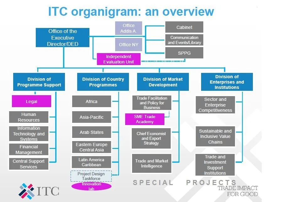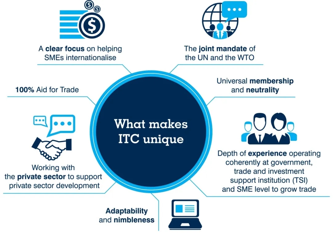 长期以来,ITC与世界各国政府决策者、经济发展机构,有关国际组织和地区性组织、贸易和投资支持机构、贸易促进组织、妇女商业组织、中小微企业等密切合作,全面致力于支持发展中国家的经济社会发展。ITC官网向全世界正式发布年度国际贸易数据、研究报告、出口潜力地图、可持续发展地图等一系列国际经济贸易投资的数据资源和政策分析工具。