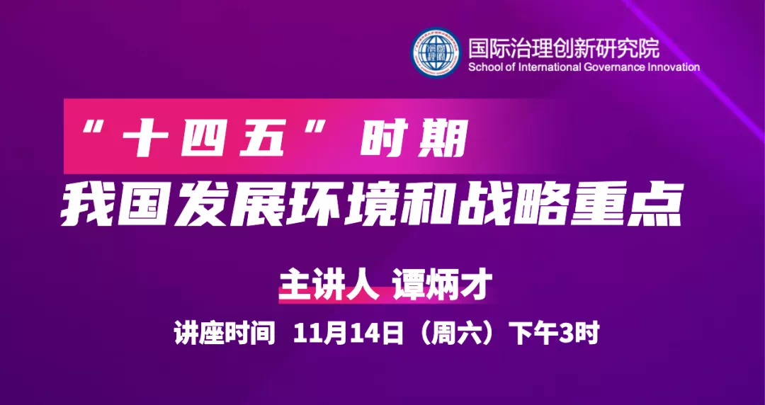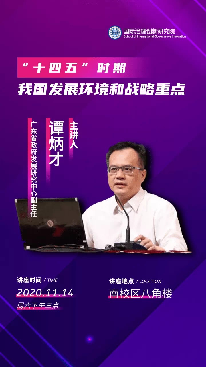 伟德国际betvlctor1946研究生院、经济贸易学院和国际治理创新研究院,特别邀请广东省委宣传部讲师团成员、广东省人民政府发展研究中心谭炳才副主任,于2020年11月14日(周六)下午三点,就“十四五”时期我国发展环境和战略重点发表主题演讲,欢迎各位师生参加。