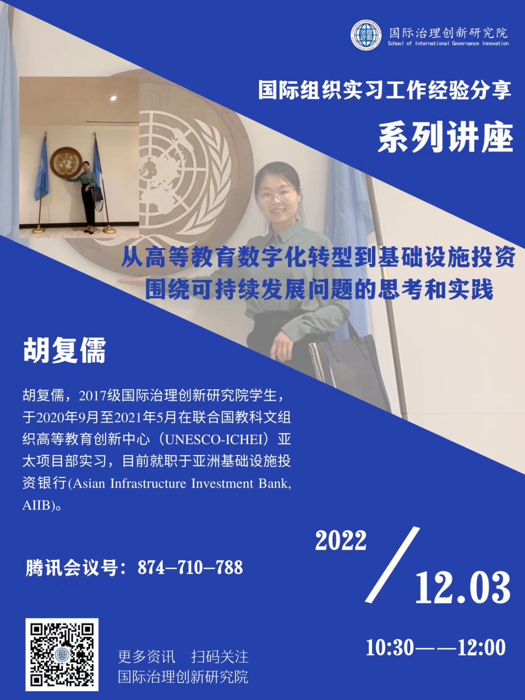 2022年12月3日,国际治理创新研究院将邀请2017级学子黄梁峻、胡复儒出席“国际组织实习工作经验分享系列讲座”。黄梁峻同学将介绍他在联合国开发计划署亚太办事处的实习工作情况,分享的题目是“在联合国开发计划署开启数字经济研究之路”;胡复儒同学将介绍她在联合国教科文组织实习以及在亚洲基础设施投资银行的工作情况,她演讲的题目是“从高等教育数字化转型到基础设施投资,围绕可持续发展问题的思考和实践”,欢迎老师同学们参加。