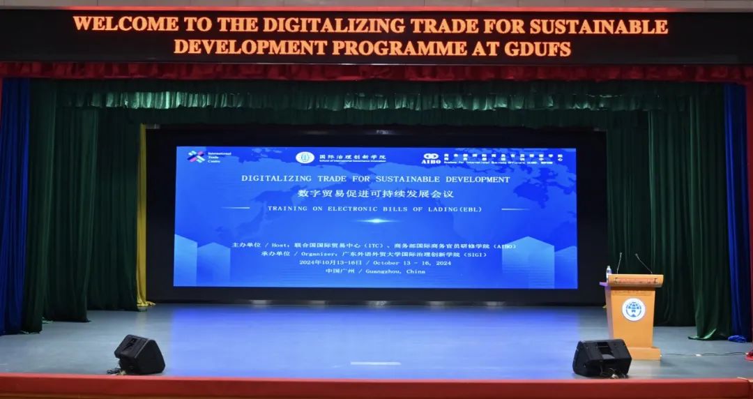 From October 14 to 16, 2024, the Digitalizing Trade for Sustainable Development was successfully held at Guangdong University of Foreign Studies (GDUFS), co-hosted by the International Trade Centre (ITC) and the Academy for International Business Office (AIBO) of the Ministry of Commerce and organized by the School of International Governance Innovation (SIGI) at GDUFS. Business officials from more than 30 developing countries in the Global South and officials serving in international organizations jointly discussed the current situation and future trend of digital trade development and highlighted its essential role in sustaining the development of global trade.