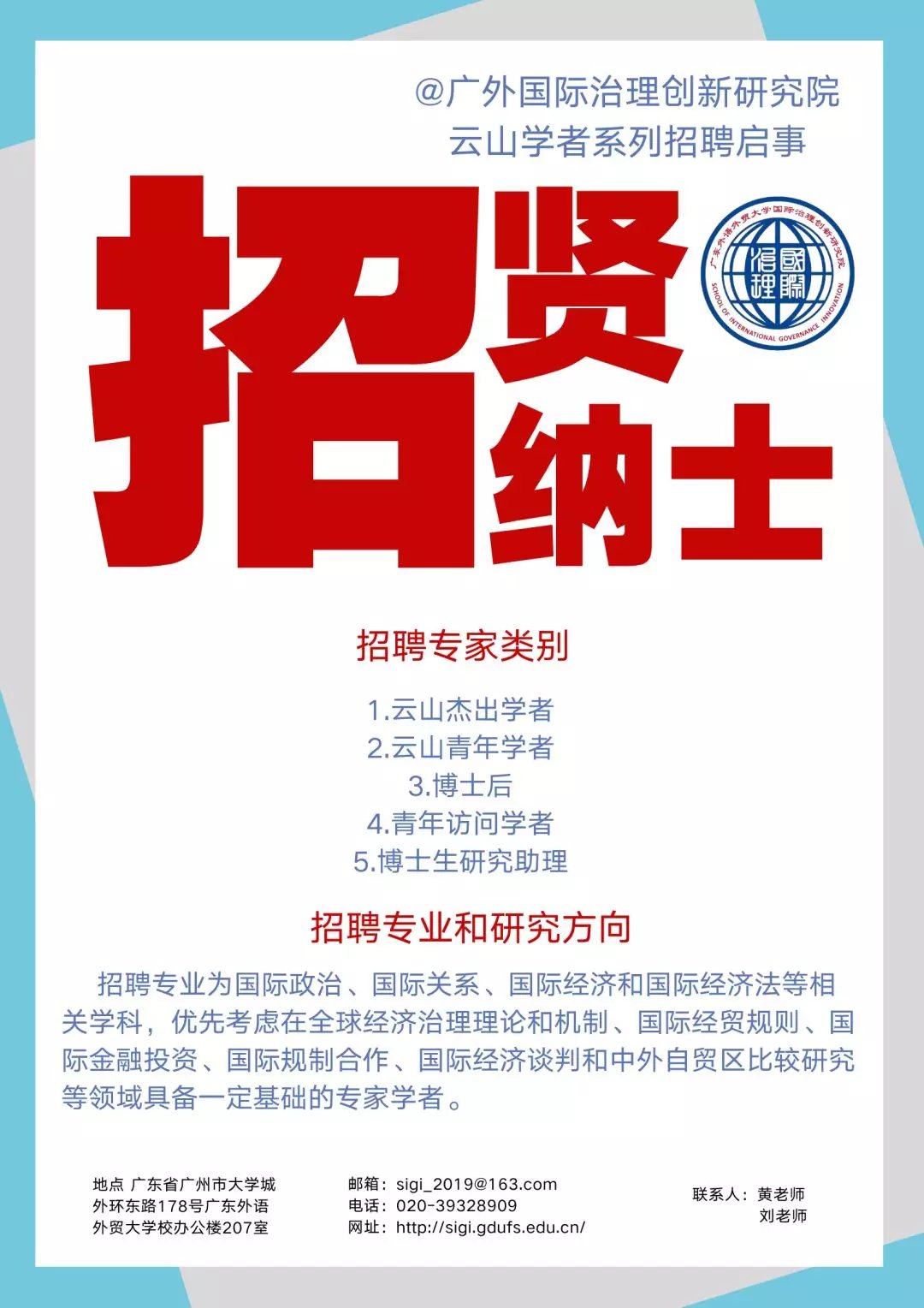 伟德国际betvlctor1946是一所具有鲜明国际化特色的重点大学,是华南地区国际化人才培养和外国语言文学、对外经济贸易、国际战略研究的重要基地。为了进一步强化国际经贸规则研究、加速培养参与全球经济治理综合型、复合型高端国际人才,我校设立国际治理创新研究院,由云山领军学者赵龙跃教授负责。国际治理创新研究院将进一步强化对国际经贸规则和全球经济治理方面的理论政策研究,现面向海内外诚聘英才。