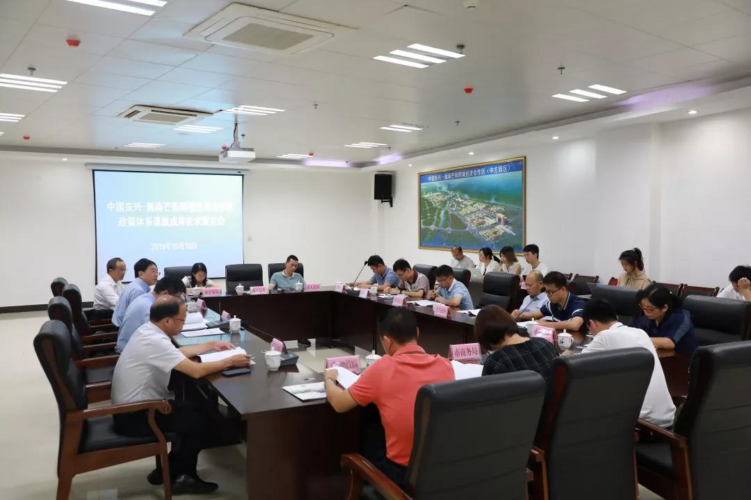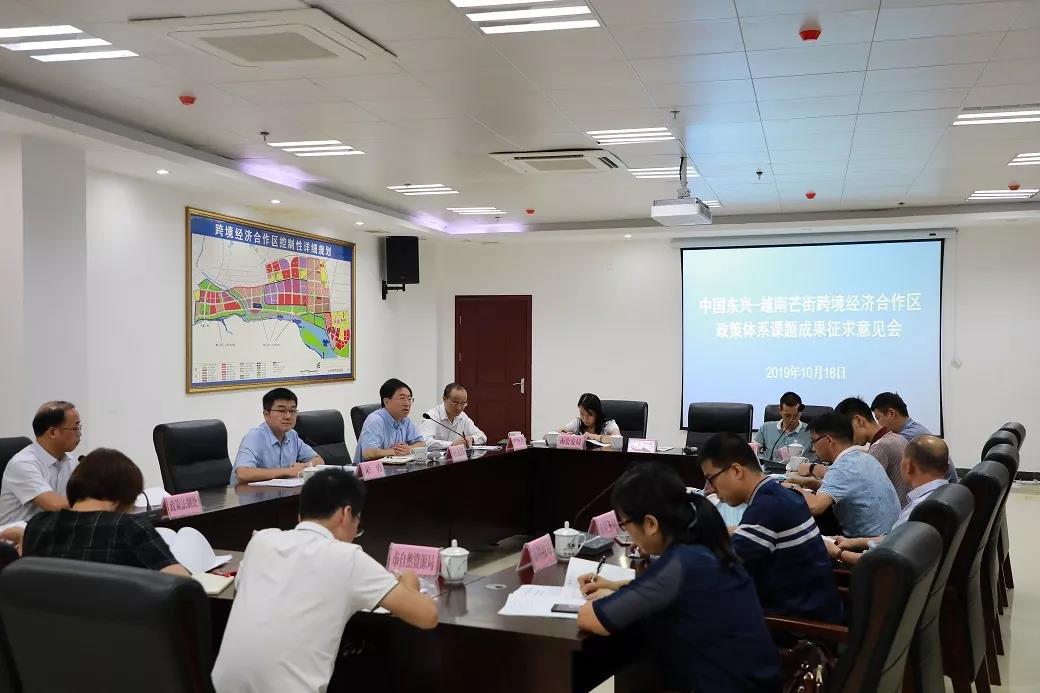 《中国东兴—越南芒街跨境经济合作区研究课题》成果征求意见会由东兴试验区管委会宋勇助理主任主持,邀请防城港市政府有关部门领导和专家,围绕中越跨境经济合作区发展所面临的各种问题进行讨论。防城港市外事办、发改委、国土局、商务局,及东兴市政府、东兴海关等相关部门领导代表出席本次会议。
