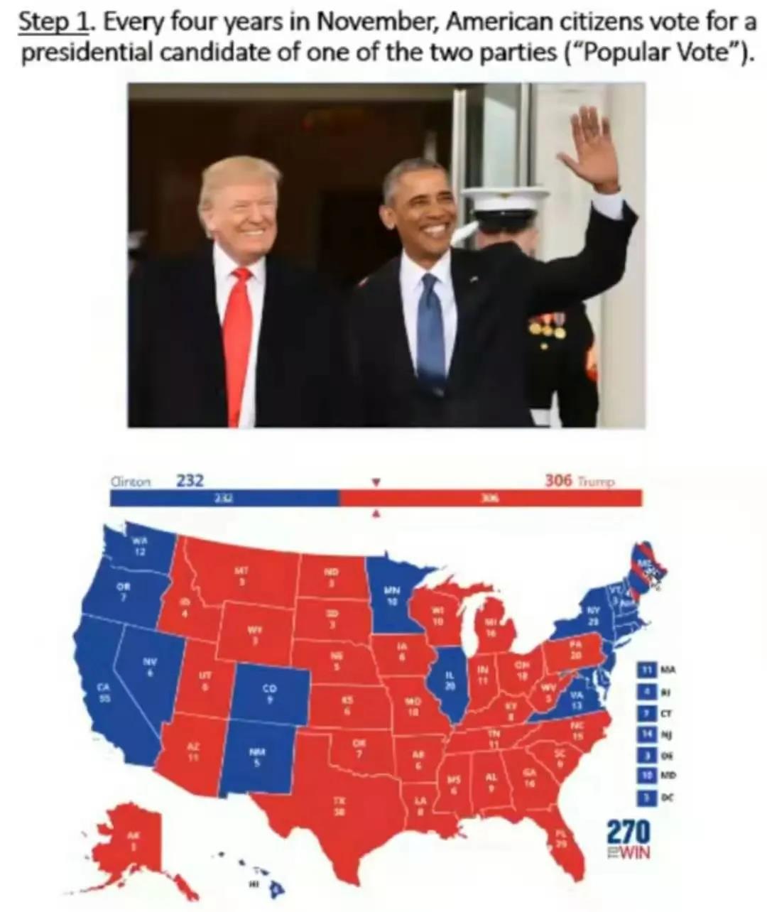 其次是组成选举人团,即在普选完成后,各州统计出本州获胜的候选人,再由各州的议会选出本州的选举人,并组成一个选举人团。选举人团必须按照本州的普选结果投票,本州的选举人票只能投票给本州获胜的候选人,除缅因州、内布拉斯加州外。美国全部“选举人票”共538张,是参议员(100名)、众议员(435名)、华盛顿特区代表(3名)的总数。参议员按州分配,50州每州2名;众议员按人口产生,约50多万人选出一名。按照选举人团制度,候选人在各州赢得的选举人票累计超过538票的一半(270张)时当选总统。