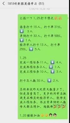 方式:英语学习冬令营以微信群为主要的“学习阵地”,同学们每日完成学习任务后在微信群中打卡,学委进行汇总统计;同时相应的建立了QQ群,用于上传相关资料(由于大家的英语基础不同,同学可自由选择是否进群)