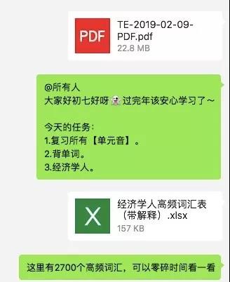 创新班的英语委员陈卓同学每日在微信群内公布当天的学习任务,发送相关的学习资料,来开启一天的英语学习!